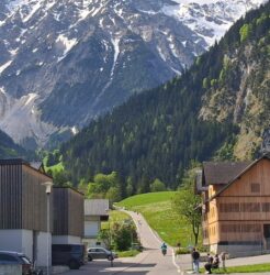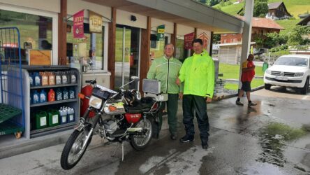 “We”, zijn Fré op zijn GTS50, Stefan op de K80, Wim op de K80, Wybe op een Honda SS50 en ik op mijn blauwe GTS50. De motoren stonden op de aanhanger en na een voorspoedige dagreis kwamen we bij Büchboden aan in het hart van het natuurpark Grote Walsertal.