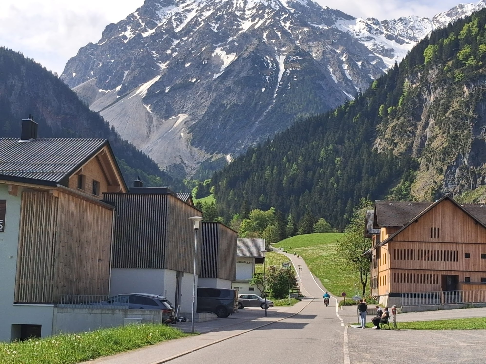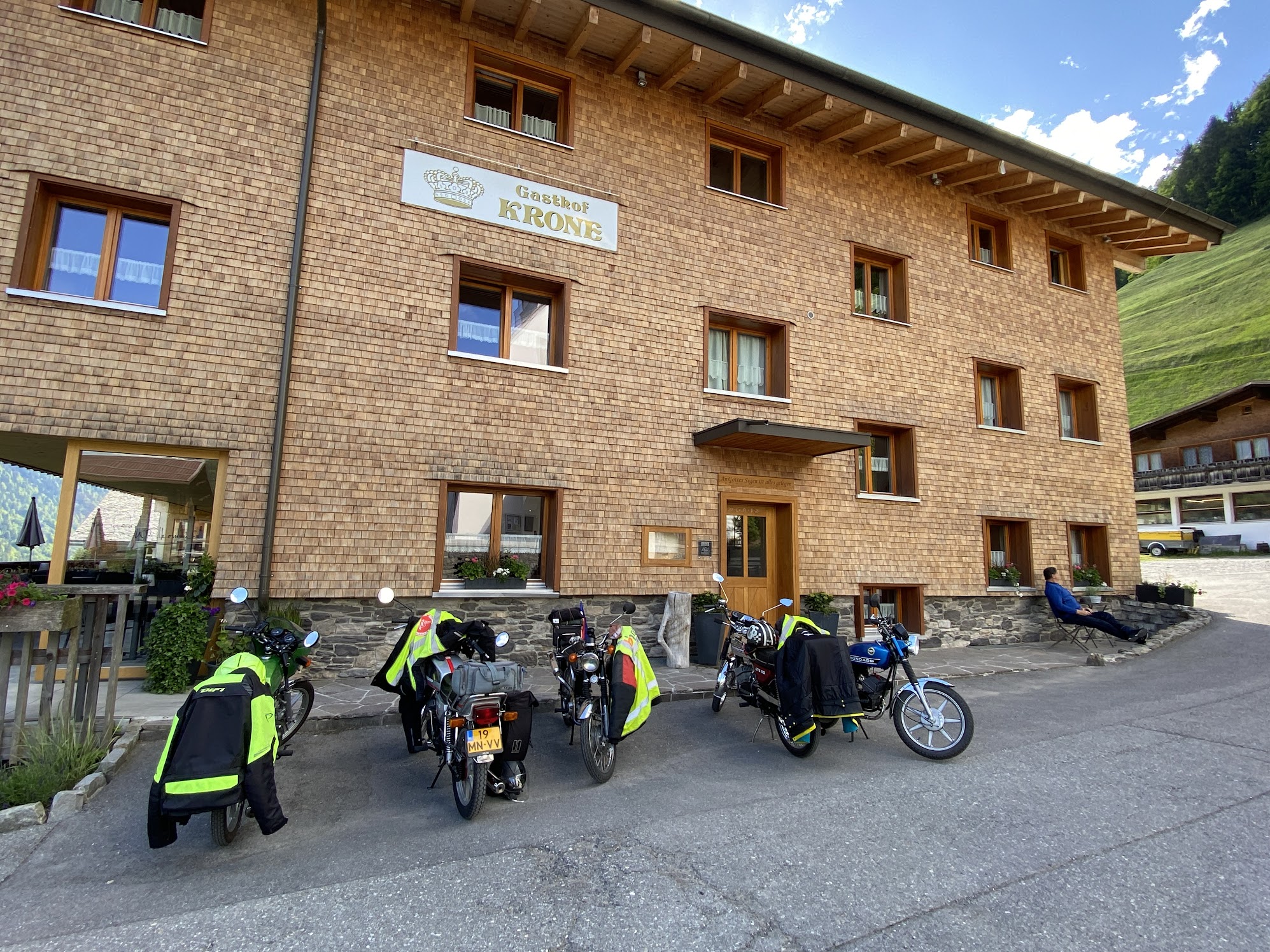 “We”, zijn Fré op zijn GTS50, Stefan op de K80, Wim op de K80, Wybe op een Honda SS50 en ik op mijn blauwe GTS50. De motoren stonden op de aanhanger en na een voorspoedige dagreis kwamen we bij Büchboden aan in het hart van het natuurpark Grote Walsertal.