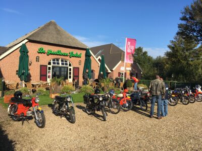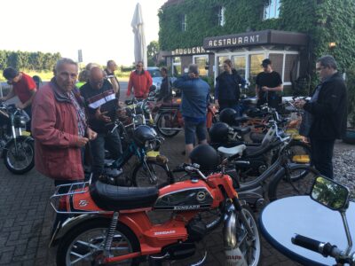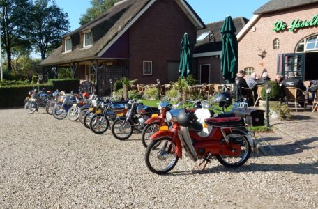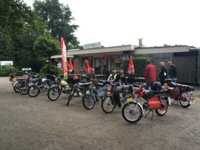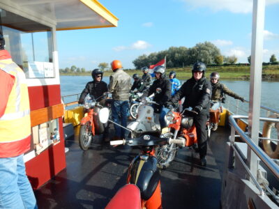 “Vorig jaar, vroeg in de herfst hebben we voor het eerst een dagvullende tocht gemaakt. We vertrokken met 18 brommers om half 10 uit Aalten. Via prachtige B-wegen en een gezellig terras in Doesburg belandden we bij de pont Olburgen-Dieren. Vandaar zijn we via Ellecom en de Steeg over de Posbank naar Kasteel Rozendaal gereden.