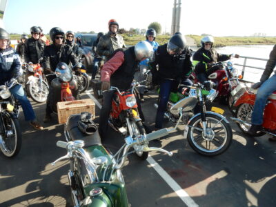 De heide op de Posbank zag er echt fantastisch uit. Heerlijk om over de Zijpenberg met zijn scherpe haarspeldbochten, stijging tot bijna 8%, door het paarse heidegebied te toeren. Na een heerlijke lunch in Rheden zijn we via het voetveertje bij Lathum, door de Slangenburg weer naar de Achterhoek teruggereden” aldus de organisatoren van deze rit, Bert Klein Geltink en Henk te Paske. “Gelukkig hebben we een bezemwagen mee laten rijden, want in Doetinchem had één van de brommers er opeens geen zin meer in. Nee, we noemen geen merk, dat ligt nog net zo gevoelig als 40, 45 jaar geleden.”