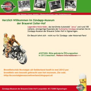 Fantastische motorfietsen, de beroemde auto “Janus”, de Zündapp Bella scooter en ongeveer 100 andere unieke tentoonstellings items van Zündapp zijn te zien in Zündapp Museum van Brouwerij Zoller-Hof in Sigmaringen, Baden-Württemberg in zuid-Duitsland.